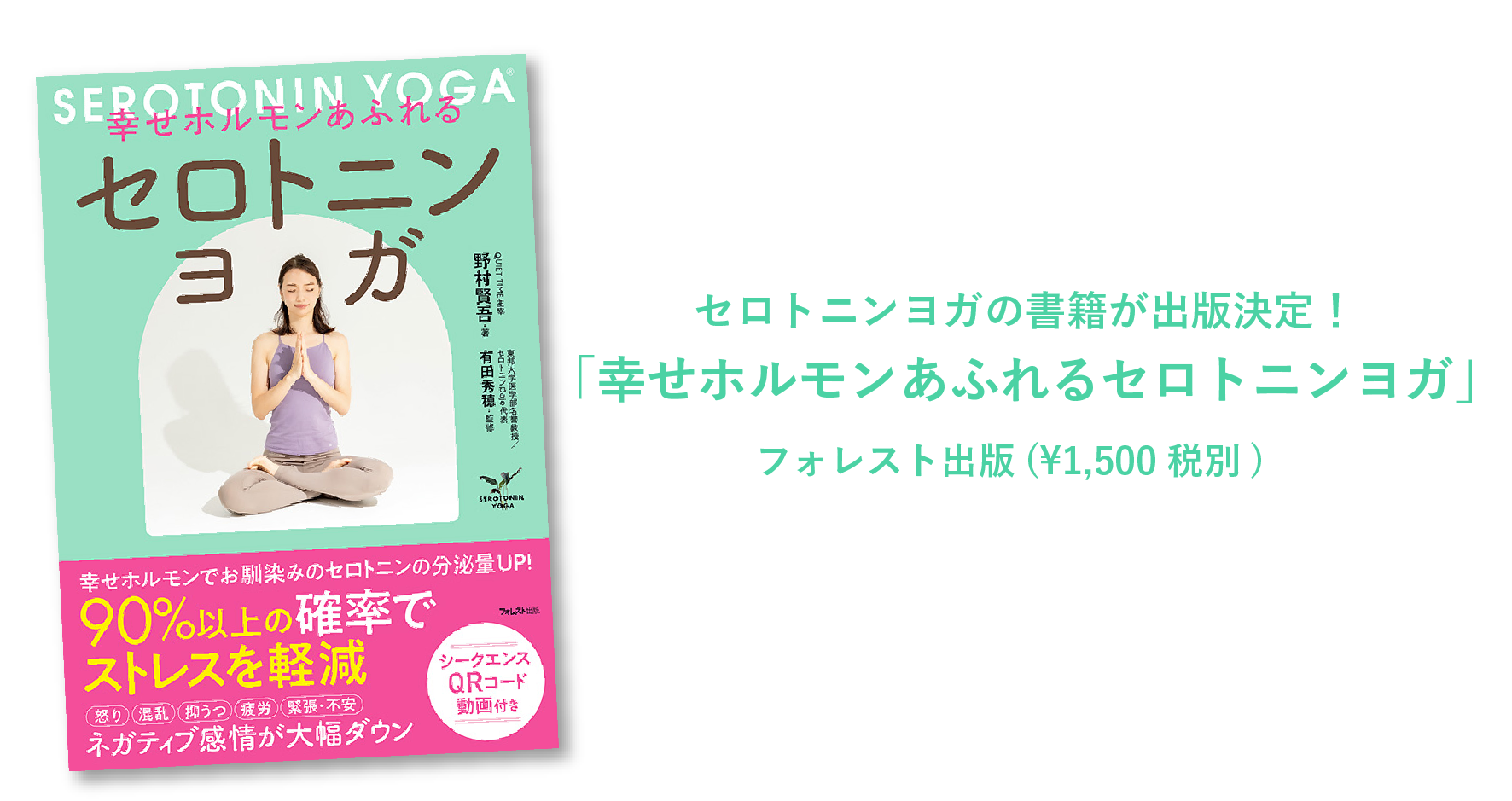 著者はセロトニンヨガディレクターの野村賢吾。セロトニン研究の第一人者、東邦大学名誉教授有田秀穂医師が監修。モデルはセロトニンヨガ指導者育成コースでも講師を担当している密山礼巳先生が担当してくれました。